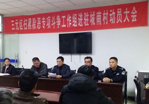 2月28日,三元區城東鄉城南村召開掃黑除惡專項斗爭工作組進駐城南村動員會。三元區掃黑除惡專項斗爭城南村工作組組長、區政法委副書記李顯輝,三元公安分局、三元檢察院、區法院、區司法和城東鄉等單位工作組成員出席會議,城南村兩委干部及鄉人大代表、村民小組長、全體黨員參加會議,城東鄉黨委書記李鴻主持會議。