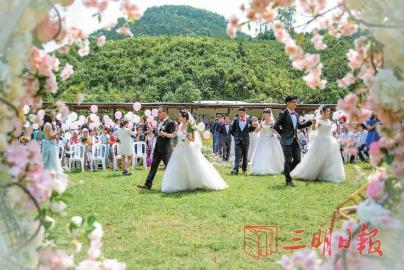 近日,由沙縣團縣委、縣婦聯、縣總工會聯合舉辦的“春暖花開愛在虬城”2018年沙縣集體婚禮暨單身青年見面會在馬巖生態山莊舉行。來自全縣各行業的9對新人選擇集體婚禮的方式,用實際行動踐行移風易俗,并向全社會發出了婚事新辦、婚事簡辦的文明倡議。