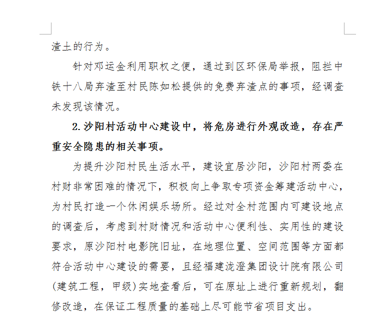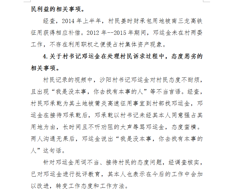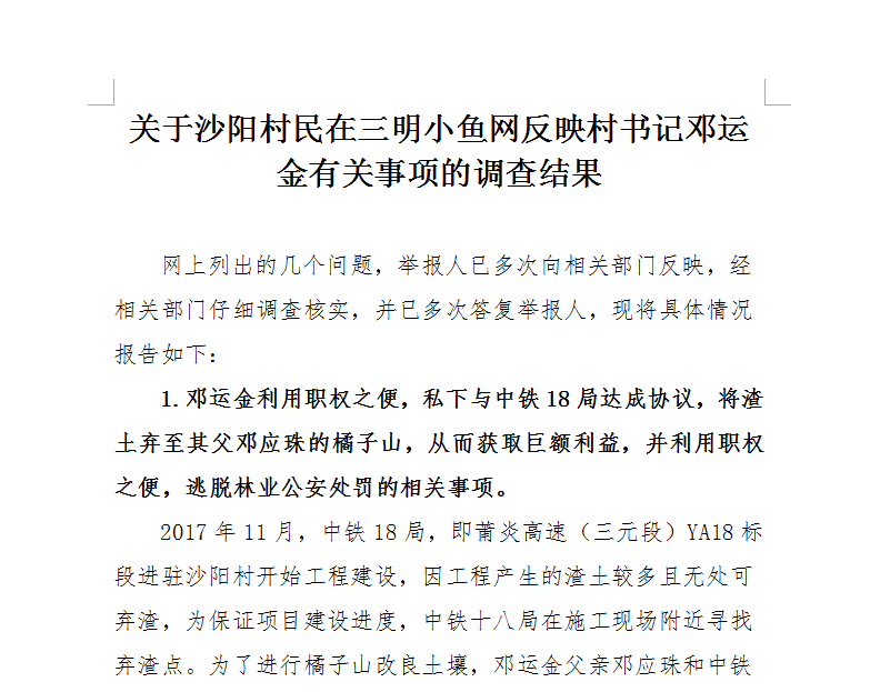 關于沙陽村民在三明小魚網(wǎng)反映村書記鄧運金有關事項的調查結果