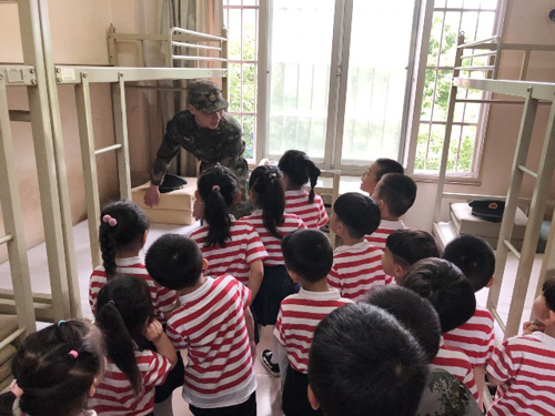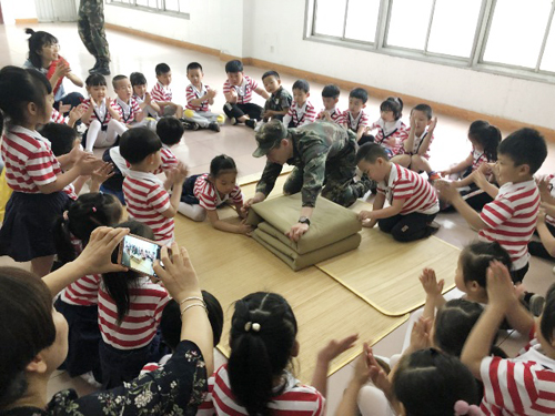 孩子們排著整齊的隊伍,在解放軍叔叔的引領(lǐng)下,走進(jìn)軍營,參觀健身房、裝備室、會議室、俱樂部、寢室和廚房。當(dāng)看到“豆腐塊”一樣的被子、衣柜里整齊的衣服、櫥柜上站軍姿般擺放的物品孩子們贊嘆不已。隨后孩子們有秩序的學(xué)習(xí)體驗疊軍被、站軍姿、敬軍禮,孩子專心致志學(xué)得有模有樣。活動的最后,孩子們?yōu)榻夥跑娛迨鍌儷I(xiàn)上歌曲《小海軍》,為辛苦付出的解放軍叔叔們送上自己制作的花束和蛋糕。