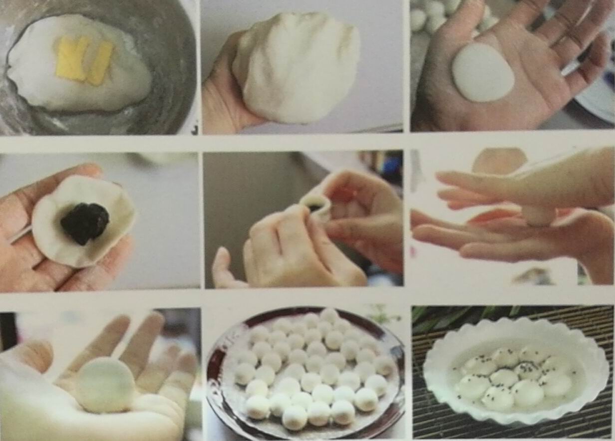 1、主要原料:糯米。 2、制作方法: ⑴取100g上好的黑芝麻,放入平底鍋中,用小火耐心翻炒,待聽到鍋中的黑芝麻發(fā)出“啪啪"聲,且能聞到明顯的芝麻清香時,黑芝麻就算炒好了。 (2)將黑芝麻倒在案板上攤開,再稍稍放涼,接著用搟面杖搟壓成黑芝麻碎,或放入打碎機中攪打成黑芝麻碎。 (3)選120g較厚的豬板油,用手從豬板油邊緣處將2筋膜揭開,再小心地完全撕下,接著將另一面的筋膜用同樣的方法撕下,再把豬板油切成小丁。 (4)把黑芝麻碎、豬板油小丁和綿白糖(100g)放入大碗中,戴上衛(wèi)生手套,用手不斷地攪拌抓攥,使3種餡料充分揉和在一起,形成一整塊,看不到白色的豬板油即可。(注意:豬板油中的筋膜較多,如果在攪拌過程中發(fā)現(xiàn)殘余的筋膜要挑出去除,以免影響?zhàn)W料的口感) (5)將黑芝麻餡料用手均分成若干份,每份約10g重,再用手拔成小圓球。 (6)在400g湯圓粉中逐漸調(diào)入250ml溫開水,并用手不停混合攪拌。 (7)最后和成一個軟硬適中的面團,再靜置30分鐘,接著將面團搓成長條狀,再切成大小均勻的小段。 (8)用手將粉團搓成圓球狀。 (9)保持雙手的干爽,將粉團放入手中,小心地捏成酒盅狀湯圓皮。 (10)在每個湯圓皮中放入1枚黑芝麻餡料塊,再將面皮邊緣向上端收起,直至將黑芝麻餡料塊完全包裹住。 (11)再將粉團搓和成圓球狀,制成湯圓生坯。 (12)湯鍋中放入適量清水,大火燒沸后放入湯圓生坯。 (13)用湯勺沿鍋邊推轉(zhuǎn),大火煮制約3分鐘,待湯圓逐漸浮起。 (14)湯水沸騰時,再倒入少許冷水,繼續(xù)用大火煮制3分鐘,最后待湯圓再次全部浮起。 (15)最后湯水燒沸后,將湯圓及湯一起盛入碗中即可。 明代劉若愚在《酌中志)中記載了元宵的做法:”其制法,用糯米細(xì)面,內(nèi)用核桃仁、白糖、玫瑰為餡,灑水滾成,如核桃大,即江南所稱湯圓也。”這就說幾百年來湯圓做法基本不變。