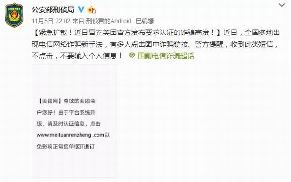 近日,公安部刑偵局發(fā)布預(yù)警:有犯罪分子冒充美團(tuán)官方平臺(tái)發(fā)送要求商戶認(rèn)證的短信,內(nèi)含釣魚網(wǎng)站鏈接,誘導(dǎo)商戶輸入身份證號(hào)、銀行卡號(hào)、手機(jī)號(hào)、驗(yàn)證碼等信息從而對(duì)商戶銀行卡進(jìn)行盜刷,造成經(jīng)濟(jì)損失。