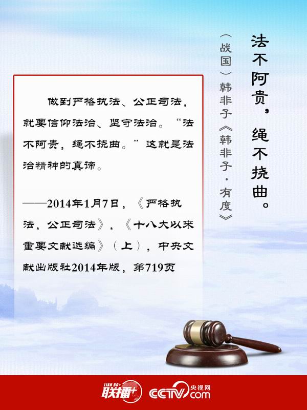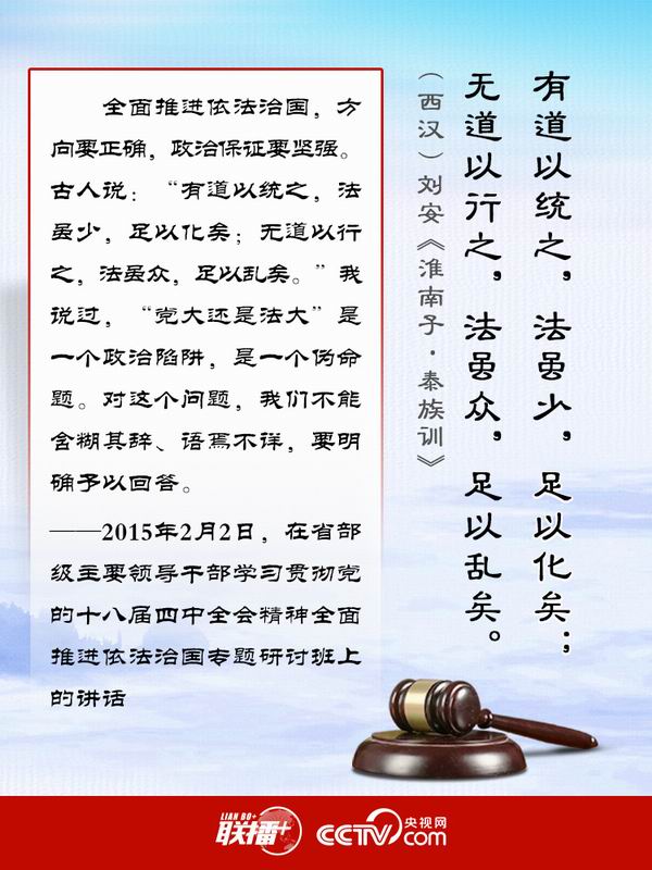 五年前,黨的十八屆四中全會在京閉幕,明確提出全面推進依法治國的總目標、重大任務。近年來,習近平總書記對法治的重視和推進一以貫之,多次引用經典名句,旁征博引地闡釋全面依法治國的要義。央視網《聯播+》特精選部分話語,與讀者共勉。