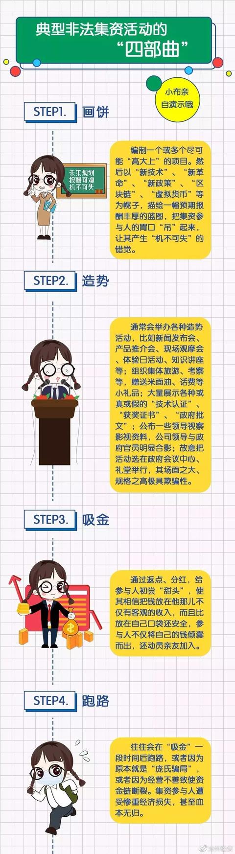 抗擊疫情仍在繼續 宅在家里不能出門的我們一定不停地刷著手機接收的信息各種各樣在這里,平檢君提醒您守護好自己的“錢袋子”謹防掉進非法集資的陷阱 什么是非法集資 非法集資,是指公司、企業、個人或其他組織未經相關部門批準,違反法律、法規,通過不正當的渠道,向社會公眾募集資金的行為,并且通常會向參與人承諾在一定期限內以貨幣、實物以及其他方式向參與人還本付息或給予回報。 下面我們通過兩個案例來了解一下↓ 案例一 2006年至2011年11月期間,犯罪嫌疑人李某單獨或先后伙同犯罪嫌疑人樊某等人以某運通公司從事民間借貸、經營資金等業務的名義向社會公眾吸收資金,且聲稱借出資金有抵押保證安全。李某等人在沒有任何資金保障及實際經營項目的情況下,通過報紙、廣告及口頭宣傳等途徑,以月息3.5%等高息回報為誘餌,先后騙取尹某某等247人投資款共計人民幣5.2億余元,造成損失共計人民幣1.8億余元。被告人樊某先后介紹徐某某等32人向李某處集資1.08億余元。2016年2月25日,某市中級人民法院以犯集資詐騙罪一審判處被告人李某無期徒刑,剝奪政治權利終身,并處沒收個人全部財產;被告人樊某犯集資詐騙罪,判處無期徒刑,剝奪政治權利終身,并處沒收個人全部財產。 案例二 2017年上半年,某市公安分局民警在日常風險排查中發現,轄區內某家居購物廣場有限公司以“零元消費”為名,通過宣傳冊、電視、微信、口口相傳等方式公開向社會宣傳,以承諾分期返還客戶本金及高額回報為誘餌,大量吸收公眾存款,涉嫌非法集資犯罪。2017年7月27日,該公安分局對該公司以涉嫌非法吸收公眾存款罪立案調查。該公司自2014年至2017年11月共向社會吸收資金共計人民幣22.4億元,涉及全國20多個省市。2018年3月,該公司非法吸收公眾存款案被移送該市人民檢察院審查起訴。 一典型非法集資活動的“四部曲”