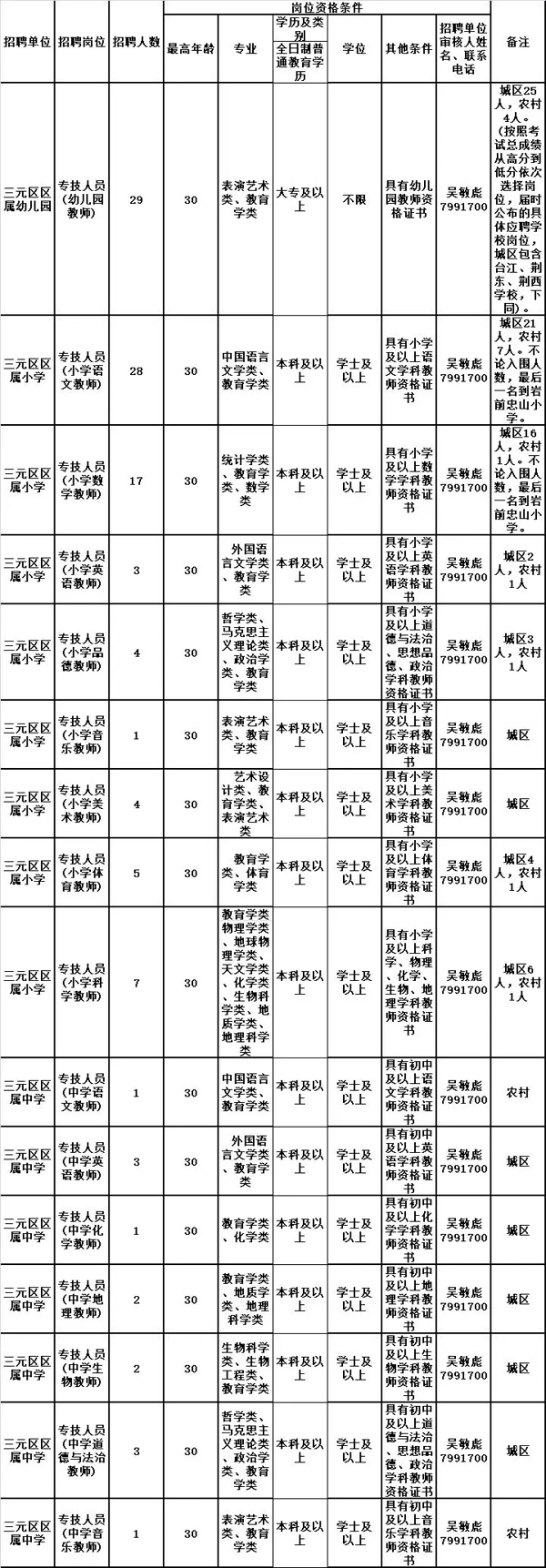 根據福建省教育廳 福建省人力資源和社會保障廳 中共福建省委機構編制委員會辦公室《關于做好2020年全省中小學幼兒園新任教師公開招聘工作的通知》(閩教師〔2020〕1號)、三明市人力資源和社會保障局《關于核準三元區2020年教育衛生所屬事業單位緊缺急需專業和中小學幼兒園新任教師公開招聘計劃的通知》(明人社〔2020〕5號)和《三明市事業單位公開招聘工作人員暫行辦法》(明人發〔2012〕33號),特制定2020年三元區區屬中小學幼兒園新任教師公開招聘方案,具體如下: 一、招聘單位、崗位、人數 三元區區屬中小學幼兒園計劃招聘教師111名,具體招聘崗位、招聘人數、資格條件等要求,詳見附件《2020年三明市三元區教育系統事業單位公開招聘工作人員崗位信息表》。 二、招聘條件 1.具有中華人民共和國國籍; 2.遵守中華人民共和國憲法、法律、法規; 3.遵守紀律、品行端正,具備良好的職業道德; 4.應具備崗位所需的學歷、專業、教師資格及崗位要求的其他條件; 5.適應招聘崗位所要求的身體條件; 6.年齡18周歲以上、30周歲以下(1989年3月16日至2002年3月16日期間出生,下同),2020年所有招聘崗位條件要求詳見《2020年三明市三元區教育系統事業單位公開招聘工作人員崗位信息表》; 7.此次不能報考的人員:曾因犯罪受過刑事處罰或曾被開除公職的人員、受黨紀政紀處分期間或者未滿影響期限以及涉嫌違紀違法正在接受有關部門調查尚未作出結論的人員、在各級公務員或事業單位招考中因違紀違規行為被記入誠信檔案且記錄期限未滿的人員、聘用后即構成應回避關系的人員、福建省在編教師、被列為失信被執行人且尚未履行義務的人員、普通高等院校在讀非應屆畢業生、現役軍人、以及法律、政策規定不得聘用為事業單位工作人員的其他人員。 8.符合報考條件的機關事業單位工作人員和國有企業職工,須征得所在單位和具有干部管理權限的組織人事部門同意后方可報考。 臺灣地區具有本科及以上學歷且符合招聘條件的可報考相應崗位。 三、報名時間、方法、要求及注意事項 (一)報名時間、方法要求 報考中小學教師崗位學歷要求為全日制本科及以上,報考幼兒園教師崗位學歷要求為全日制專科及以上。報考中小學幼兒園教師崗位需要參加全省統一筆試,參加全省統一筆試的畢業生采取網上報名的方式進行(福建省考試院門戶網站)。3月16日- 3月22日,應聘人員進行網上報名和網上繳費。 (二)注意事項 1.應聘人員應嚴格按照招聘崗位資格條件要求報名,并對網上提交的信息和相關材料真實性、準確性負責。 2.應聘人員所填寫的聯系方式應完整且準確無誤。因聯系方式有誤而影響招聘考試的,后果由應聘人員自負。 3.應聘人員所提供的照片必須為近期正面免冠二寸證件照。照片應為*.jpg格式,分辨率350dpi左右,規格100KB以下的彩色數碼證件照,單色底、免冠、頭像占照片的大部份。上傳照片后,可直接在頁面上看到上傳照片的效果,確定無誤后需點擊“確認使用本照片并提交”。對模糊不清、網絡截圖、生活照等各種不符合規定的照片將不予通過審核。 4.應聘人員必須完整、如實地填寫報名系統所要求填寫的各項信息,其中:個人簡歷應從高中(中專)階段填寫起,按照高中(中專)階段、大學階段、工作階段的順序分階段填寫至今,對因信息填寫不完整而影響資格條件判斷的及未如實填寫者將不予通過審核。 (三)具體要求 1.崗位要求的“全日制普通高校學歷”,是指報考者通過參加國家統一招生考試,錄取于經教育部批準的具有普通高等教育招生資格且執行國家普通高等教育統一招生計劃的高等院校,并按教學計劃完成學業后所取得的國家承認的學歷。本通告所述“應屆畢業生”是指2020年度畢業并取得相應學歷(學位)的畢業生。 留學歸國人員、香港或澳門地區學習人員,需提供教育部留學服務中心出具的《國外學歷學位認證書》、《香港、澳門特別行政區學歷學位認證書》或福建省人事行政部門出具的《留學回國人員身份認定審核表》、《港澳地區學習人員身份認定審核表》。 通過國內院校與國外院校聯合辦學而取得國內學歷、學位的報考者,應由國內院校出具相關證明;取得國外學歷學位的,需提供教育部留學服務中心出具的《聯合辦學學歷學位評估意見書》或《聯合辦學學歷學位認證書》。 2.根據教育部辦公廳等五部門《關于進一步做好非全日制研究生就業工作的通知》(教研廳函〔2020〕1號)文件精神,報考者以研究生學歷報考要求全日制學歷的崗位,學歷類別不作要求,但須取得與研究生學歷對應的學位。 3.本次考試使用最新的《福建省機關事業單位招考專業指導目錄》(以下簡稱《專業指導目錄》)進行專業條件 審核,報考者可以通過三明市教育信息網查詢。專業條件設置為“××類”的崗位,報考者所學專業應與《專業指導目錄》中“××類”所列的某一專業一致;專業條件設置為具體專業名稱的崗位,報考者所學專業與所列專業一致者方可報考;取得雙學歷(位)的報考人員可以選擇符合招聘崗位專業條件的任一學歷(位)報考(有學位要求的,其學歷、學位均須與招聘崗位要求的專業條件對應);報考者專業的確認,以畢業證書所署的專業名稱為準。 4.報考者的學歷應在中國高等教育學生信息網(簡稱學信網,http://www.chsi.com.cn/)上可查詢認