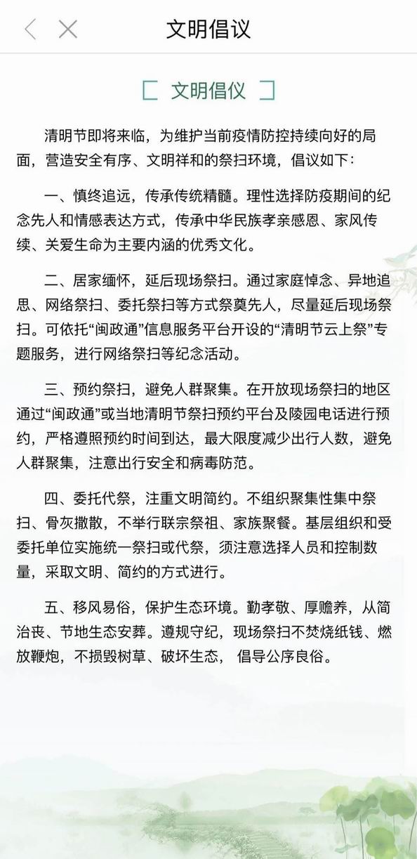 又是一年清明時 以往親朋集聚現場祭掃是 清明節活動的主要內容 但是今年清明節 正值疫情防控關鍵期 為方便廣大群眾緬懷先人、預約祭掃,福建省民政廳依托“閩政通”信息服務平臺開設“清明云上祭”專題服務,現已正式上線運行,讓用戶足不出戶即可表達行清追思之情。操作步驟如下: