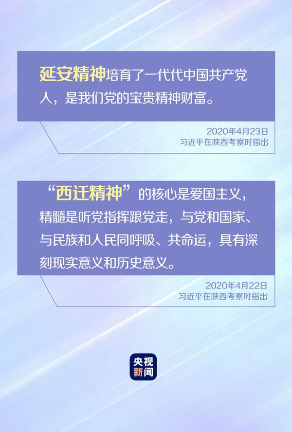 4月下旬,習近平總書記赴陜西考察調研時強調,努力克服新冠肺炎疫情帶來的不利影響,確保完成決戰決勝脫貧攻堅目標任務,全面建成小康社會。 此次考察,總書記強調了兩大寶貴的精神財富——“西遷精神”“延安精神”。 在西安交通大學,習近平勉勵廣大師生大力弘揚“西遷精神”,抓住新時代新機遇,到祖國最需要的地方建功立業,在新征程上創造屬于我們這代人的歷史功績。 關于延安精神,習近平指出,要堅持不懈用延安精神教育廣大黨員、干部,用以滋養初心、淬煉靈魂,從中汲取信仰的力量、查找黨性的差距、校準前進的方向。