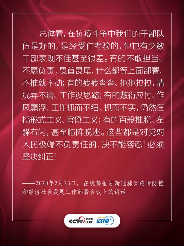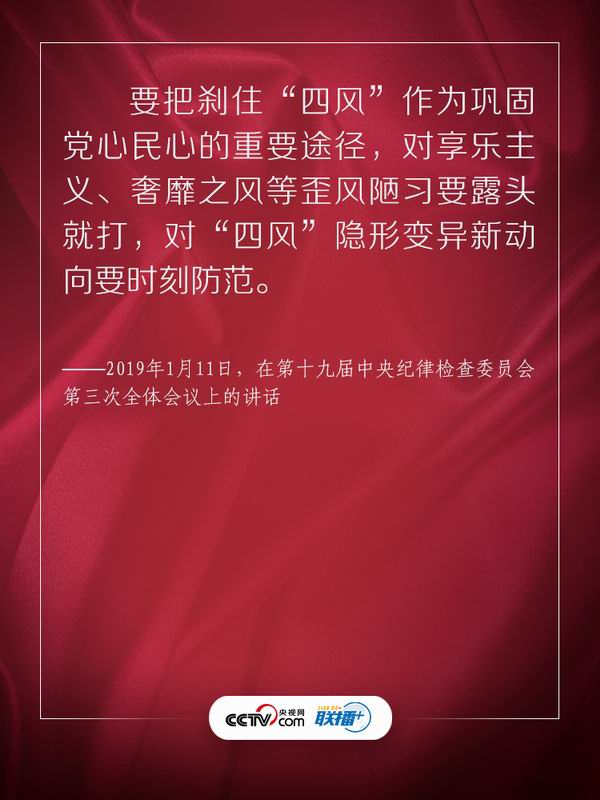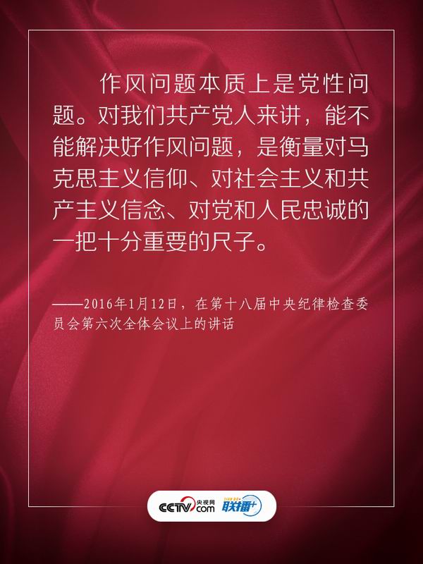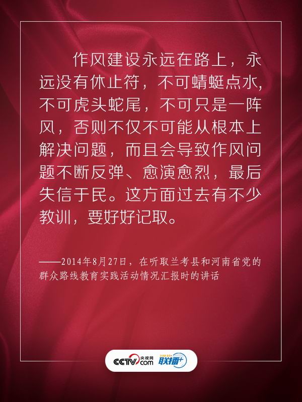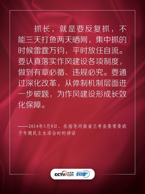 “作風(fēng)建設(shè)是永恒課題,要標(biāo)本兼治,經(jīng)常抓、見常態(tài),深入抓、見實效,持久抓、見長效,通過立破并舉、扶正祛邪,不斷鞏固和擴(kuò)大已經(jīng)取得的成果,努力以優(yōu)良的黨風(fēng)政風(fēng)帶動全社會風(fēng)氣根本好轉(zhuǎn)。”2014年5月9日,習(xí)近平總書記在指導(dǎo)蘭考縣委常委班子黨的群眾路線教育實踐活動專題民主生活會時強(qiáng)調(diào)。 黨的作風(fēng)就是黨的形象,關(guān)系人心向背和黨的生死存亡。近年來,習(xí)近平多次作出重要指示批示,為持之以恒加強(qiáng)黨的作風(fēng)建設(shè)指明方向。 作風(fēng)建設(shè)這個永恒課題如何才能做到常抓不懈?央視網(wǎng)《聯(lián)播+》帶你重溫總書記關(guān)于作風(fēng)建設(shè)的重要論述。