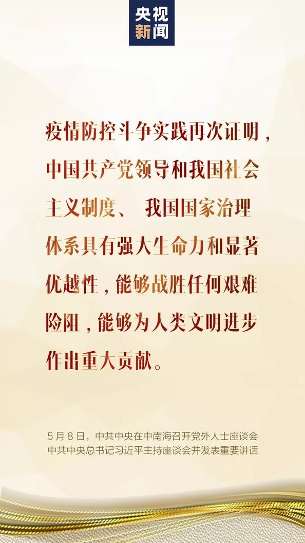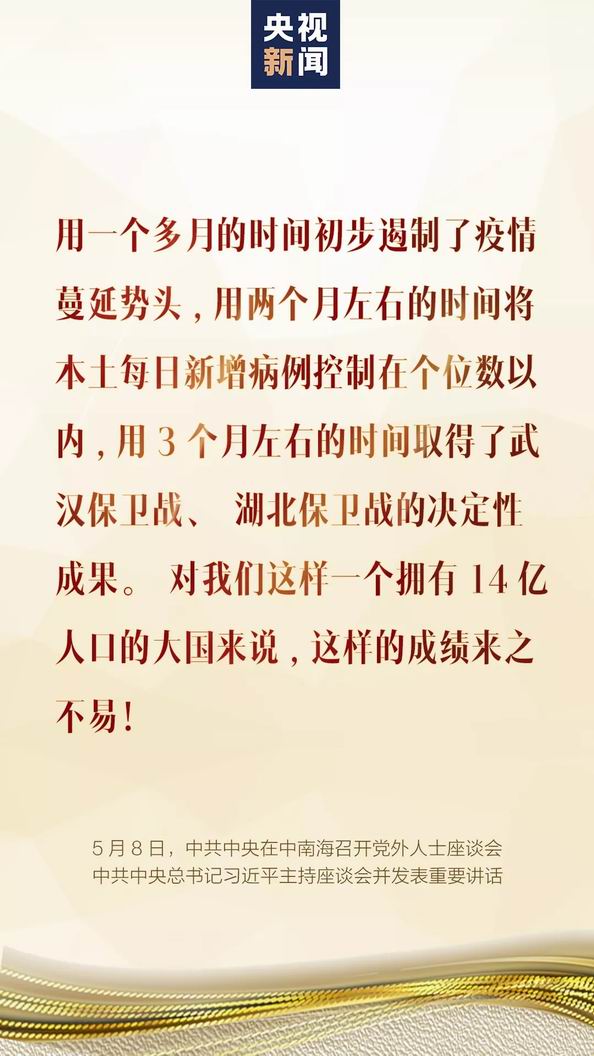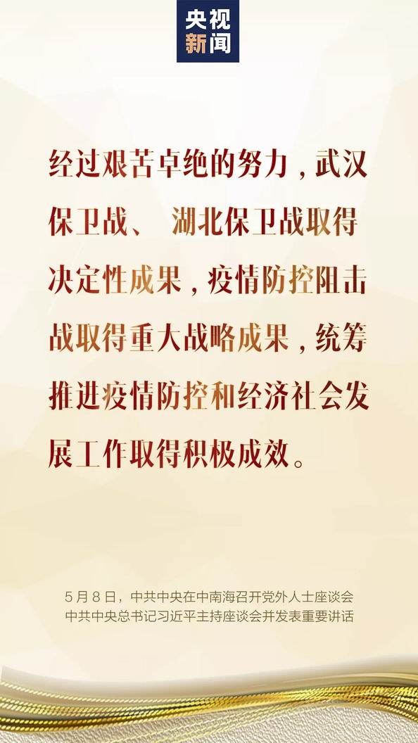 5月8日,中共中央在中南海召開黨外人士座談會,就新冠肺炎疫情防控工作聽取各民主黨派中央、全國工商聯和無黨派人士代表的意見和建議。中共中央總書記習近平主持座談會并發表重要講話。 一、形勢判斷 武漢保衛戰、湖北保衛戰取得決定性成果,疫情防控阻擊戰取得重大戰略成果,統籌推進疫情防控和經濟社會發展工作取得積極成效。 當前,境外疫情暴發增長態勢仍在持續,我國外防輸入壓力持續加大,國內疫情反彈的風險始終存在。