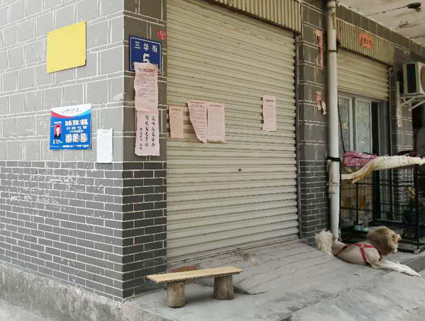巖前主街上沿街店鋪小廣告亂粘貼和養狗現象。 |
