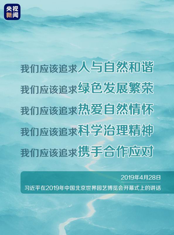 2019年6月5日,世界環(huán)境日全球主場(chǎng)活動(dòng)在浙江省杭州市舉行,習(xí)近平主席致賀信。習(xí)近平指出,人類只有一個(gè)地球,保護(hù)生態(tài)環(huán)境、推動(dòng)可持續(xù)發(fā)展是各國(guó)的共同責(zé)任。建設(shè)全球生態(tài)文明,需要各國(guó)齊心協(xié)力,共同促進(jìn)綠色、低碳、可持續(xù)發(fā)展。 從3月底4月初在浙江考察時(shí)調(diào)研安吉、西溪濕地,到4月下旬在陜西考察時(shí)深入秦嶺,再到5月中旬在汾河太原城區(qū)晉陽(yáng)橋段考察,習(xí)近平總書(shū)記的考察行程和重要指示,一再宣示生態(tài)文明建設(shè)是關(guān)系中華民族永續(xù)發(fā)展的根本大計(jì)。 面向未來(lái),中國(guó)也愿同各國(guó)一道,共同建設(shè)美麗地球家園,共同構(gòu)建人類命運(yùn)共同體。