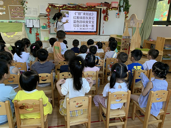 活動中,家長告訴孩子哪些是可回收垃圾、不可回收垃圾、廚余垃圾、有害垃圾,幫助孩子初步學會垃圾分類;通過親子童謠創編,讓垃圾分類深入每個家長與幼兒的心中。同時各班開展童謠傳唱,以觀看PPT、圖片等形式,學會正確投放各類垃圾。