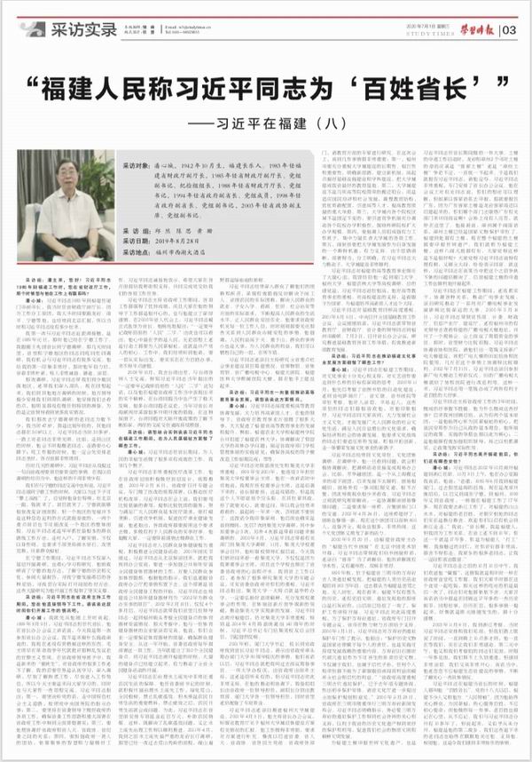 采訪對象:潘心城,1942年10月生,福建長樂人。1983年任福建省財政廳副廳長,1985年任省財政廳副廳長、黨組副書記、紀檢組組長,1988年任省財政廳廳長、黨組書記,1994年任省政府副省長、黨組成員,1998年任省政府副省長、黨組副書記,2003年任省政協副主席、黨組副書記。 采訪組:邱然黃珊陳思 采訪日期:2019年8月28日 采訪地點:福州市西湖大酒店 采訪組:潘主席,您好!習近平同志1985年到福建工作時,您在省財政廳工作,那個時候您與他在工作上有聯系嗎? 潘心城:習近平同志1985年到福建任廈門市副市長,我當時任省財政廳副廳長。因為工作分工原因,我大半時間要跑龍巖、南平、寧德等地,也經常到北京匯報,所以當時和習近平同志沒有多少往來。 我第一次與習近平同志近距離接觸,是在1989年元旦,那時他已經在寧德工作了。我跟隨王兆國省長到寧德調研。那幾天時間里,省里和寧德地區的同志同吃同住同調研,我有機會與習近平同志有較多交流。他給我的第一印象非常好,那時他年輕力壯,穿著非常樸素,待人非常誠懇、謙遜、親切。 那次調研,習近平同志帶我們到少數民族地區,還帶我們深入部隊。現在回想起來,我們到其他地方調研的時候,地方領導極少安排我們到部隊調研。他安排我們去看的點,很明顯都沒有做任何特別的準備,為的是讓省領導看到更多真實情況。 我們那次去寧德調研的老同志為數不少,我當時47歲,算是比較年輕的,其他同志都在50歲以上。習近平同志當時30多歲,一路上對老同志非常關照。比如,走到山區的時候,他會不時提醒老同志,走路要小心腳下;吃工作餐的時候,他一定會先安排老同志坐好,各方面都非常周到。 歷時幾天的調研中,習近平同志從沒提過一句向省政府要項目要資金的事情。在我以前調研的經歷當中,他這樣的干部非常少有。 我們在與寧德的同志交流中也聽說,習近平同志剛到寧德工作的時候,大家以為這下子可“攀上高枝”了,總覺得他身份特殊,往北京一跑,錢就來了,項目就來了,寧德就能夠很快改變貧困面貌。但一個地區的發展并不是這種急功近利的方式就能奏效的,一兩個重點項目也不可能改變一個地區的整體面貌。習近平同志還是牢牢抓住最根本的群眾路線工作方法,走村入戶,了解實情,不僅以身作則,也要求干部堅持滴水穿石,攻堅克難,共謀群眾福祉。 在寧德工作期間,習近平同志不僅深入基層開展調研,也潛心學習和研究。他細致研讀了寧德的地方志,了解寧德的歷史和文化,參閱大量報告,尋找寧德發展滯后的各種癥結,尋找切合實際打開局面的好方法。這些大量研究為他開展工作提供了堅實支撐。 采訪組:習近平同志在省政府主持工作期間,您在他直接領導下工作。請談談這段時間你們開展工作的情況吧。 潘心城:我就先從他剛上任時談起。1999年8月9日,習近平同志擔任代省長,他在省長辦公會議上講話說,今天我是第一次參加省長辦公會議,我不是來搞什么施政演說的,我現在還沒有資格搞這樣的東西。毛主席早在革命戰爭年代就批評那種亂發議論的官僚主義作風。在省政府領導班子中,我是新來的“插班生”,對省政府的很多工作還不了解。我的首要任務是認真學習,深入調研,盡快了解熟悉工作,盡快進入工作角色,所以今天主要是來向大家學習的,同時也與大家作一些思想交流。習近平同志指出:第一,要堅決聽黨的話,走中國特色社會主義道路,按照黨中央國務院的指示辦事;第二,要堅持在省委領導下做好政府的各項工作,確保省委工作思路和重大部署在省政府工作中得到全面貫徹落實;第三,要處理協調好省政府和省人大、省政協、省紀委之間的關系;第四,要加強政府一班人的團結,依靠集體的智慧和力量做好工作。習近平同志誠懇地表示,希望大家在各方面都給我幫助和支持,共同完成黨交給我們的各項工作任務。 習近平同志主持省政府工作期間,各項工作都取得了優異成績,而且大家在他的領導下工作都是很開心的,也與他建立了深厚感情。在2000年省人代會上,習近平同志被正式選舉為省長。他響亮地提出:“一定要牢記政府前面的‘人民’二字。”由此也可以看出,他心中最在乎的是人民,無論思想上還是行動上都要為人民謀福祉,這就是共產黨人的初心。工作中,我們經常聽到他講,要一切從實際出發,要實實在在為百姓辦事,來不得半點虛假。 2008年10月,我去臺灣出差,與臺灣各界人士交流,得知習近平同志當年提出的“一定要牢記政府前面的‘人民’二字”這句話,以及他在福建省政府工作當中表現出來的實干精神,在臺灣同胞當中也產生了極大反響。很多臺灣同胞在議論,當年習省長對海峽兩岸采取很多開明開放的措施。在這種氛圍下,臺灣同胞對大陸開放政策的了解不斷加深,兩岸的交流交往通商持續增強。 采訪組:請您結合實例談談習近平同志在福建工作期間,在為人民謀福祉方面做了哪些工作。 潘心城:習近平同志任省長期間,為人民的幸福生活做了很多卓有成效的工作。我舉幾個例子。 習近平同志非常重視醫療改革工作。他在省政府層面積極做好頂層設計,統籌推進。2000年11月16日,省政府召開專題會議,專門做了醫改的統籌部署,以推動醫療機構改革。習近平同志在會上說,我們要用比較低廉的費用,提供比較優質的服務,努力滿足廣大人民群眾基本醫療需求,要打破壟斷,引進競爭機制,促進醫療