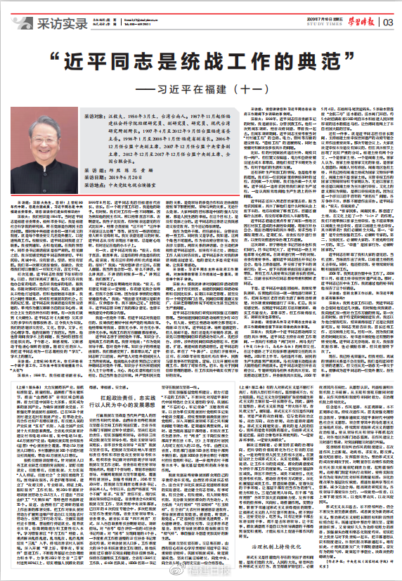 采訪對象:汪毅夫,1950年3月生,臺灣臺南人。1987年11月起任福建社會科學院助理研究員、副研究員、研究員、現代臺灣研究所副所長。1997年4月至2012年9月任臺盟福建省委主委。1998年1月至2008年1月任福建省副省長。2006年12月任臺盟中央副主席,2007年12月任臺盟中央常務副主席,2012年12月至2017年12月任臺盟中央副主席、全國臺聯會長。 采訪組:邱然陳思黃珊 采訪日期:2019年6月20日 采訪地點:中央黨校電視臺演播室 采訪組:汪毅夫先生,您好!上世紀90年代中期,您是臺盟成員,習近平同志是中共福建省委常委,請您談談你們是如何相識的? 汪毅夫:我們相識是1994年。當時近平同志是福建省委常委、福州市委書記,我是福建社會科學院的研究員,所在黨派是臺灣民主自治同盟。那時候中共福建省委有一項不成文的制度,就是每個常委要交幾名黨外朋友,以促進統戰工作。根據安排,近平同志同我建立了聯系。我接到通知,去和他見面。在我的預想中,同市委書記談話應該是很嚴肅的。但見面之后,我深切感受到近平同志熱情親切、平和沉穩、真誠中肯,沒有套話、空話,更沒有官腔。我們第一次聊天就很愉快,很融洽,我覺得我們可以像朋友一樣知無不言、言無不盡。 初次見面,近平同志給我留下很好的印象。以后,我們果真成了朋友。他不僅告訴我他辦公室的電話,也告訴我他家的電話,跟我說,你隨時都可以給我打電話。其后,我雖然從未給他打過電話,但和他接觸越來越多,我們之間經常聯系,時或有相談甚歡的機會。在我的記憶里,近平同志找我談話是沒有預設話題的,單純作為朋友聊聊各自的讀書心得,談社會上發生的各種各樣的事情。有一次我們談到《大藏經》,近平同志對《大藏經》及其涉及的多學科內容都很熟悉,這令我大為嘆服。我們的話題涉及歷史、文化、哲學、文學、社會心理學等,他的見解給了我啟發。當然,他也曾詢問我學術上的問題,我當時的回答往往是膚淺的。于今思之,頗感羞愧,又頗感動于他虛心傾聽的寬容。隨著交往的深入,我把近平同志視為一位志趣相投的“學友”,學術上的朋友。 采訪組:上世紀90年代末,你們開始在一個班子里工作,工作當中有沒有碰撞出什么“火花”? 汪毅夫:1998年,我任福建省副省長。1999年8月起,近平同志先后任福建省代省長、省長。在一個班子里工作后,我是他的助手。有時候,我們對工作有一些不同理解,因為熟知他的民主作風,所以經常直言不諱,表明意見。我性子比較直,有時候表達意見的方式比較沖,經常會直接說“這不對”“這件事不應該這么處理”等等,甚至有一些話可能讓旁人聽來覺得刺耳。我發表意見建議的時候,近平同志從沒有表現出不耐煩,總是耐心地聽,有時還記在他的小本子上。 有一次,近平同志對我說:“毅夫,你敢于直言,耿直率真,這是你的特點也是你的優點。應該說,現在這樣的特點和優點是稀缺的,很好!”我說:“我對您講話才這樣。在別人面前,我當然也會想一想,要么不講話、要么講真話,不講話的時候多一些。”講到這里,我們都笑了。 近平同志也很明確地對我說:“毅夫,你有意見和建議一定要提,你的意見我會很尊重,但我不會都采納,因為很多事情的處理我要通盤考慮?!蔽艺f:“提出意見和建議是職責所在,僅供您參考,我不固執己見?!被叵肫饋?,近平同志曾采納了我的部分意見,也曾采納我意見中的部分內容。 我是一名黨外干部,但近平同志對我是信任的,鼓勵我把握好中國共產黨的統戰政策。他經常囑咐我說,宗教無小事,對臺無小事,涉外無小事。統戰工作的方方面面都很重要。 近平同志善于團結黨外干部、知識分子,是統戰工作的典范。我曾對他說:“作為黨員領導干部,您對黨外干部、知識分子的尊重是由衷的,我們都感受到了,都非常認可?!苯酵韭犃艘院笳f,共產黨人對黨外愛國民主人士當然要真誠。他說他從小就看到自己父親習仲勛同志對黨外干部、知識分子和各界愛國民主人士十分尊重、關心,真心實意和他們交往相處,自己當然也會這樣做。共產黨和民主黨派的關系,是黨領導的多黨合作和政治協商制度框架下肝膽相照、榮辱與共的關系。無論什么黨派,大家共同的目標都是中國的強大與發展,都是人民生活的幸福。在這個目標上,是沒有黨派之分的。近平同志的這番話讓我既感動又很受教育,至今還記得很清楚。 我作為黨外干部,擔任副省長,分管省政府一些工作,同時我又是學者。我知道,這兩個角色不可混淆。作為省政府分管領導,我發表涉及宗教、兩岸關系的講話前,會主動把講稿給近平同志過目,如果有不妥之處,請他讓工作人員及時告訴我。近平同志多次對我的講話稿提出過意見,他的意見大多是肯定和鼓勵,讓我非常感動。 采訪組:習近平同志主持省政府工作期間,對加強宗教管理工作提出過一些意見,請您舉個例子講講。 汪毅夫:那我就講講對民間信仰活動的管理吧。由于歷史原因,福建的民間信仰活動場所和信民比較多,長期以來缺乏管理,甚至沒有一個特定的部門去管。民間信仰覆蓋面又很廣,在缺乏管理的情況下可能發生甚至已經發生嚴重問題。 近平同志召集我們研究如何加強這方面的管理。當時福建民間信仰活動場所至少有10萬個。有人說,要把這些活動場所全都管起來,得派10萬大軍。近平同志講,場所是固定的,但人員卻不是,我們還是先不要刻舟求劍,應該先