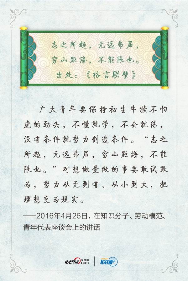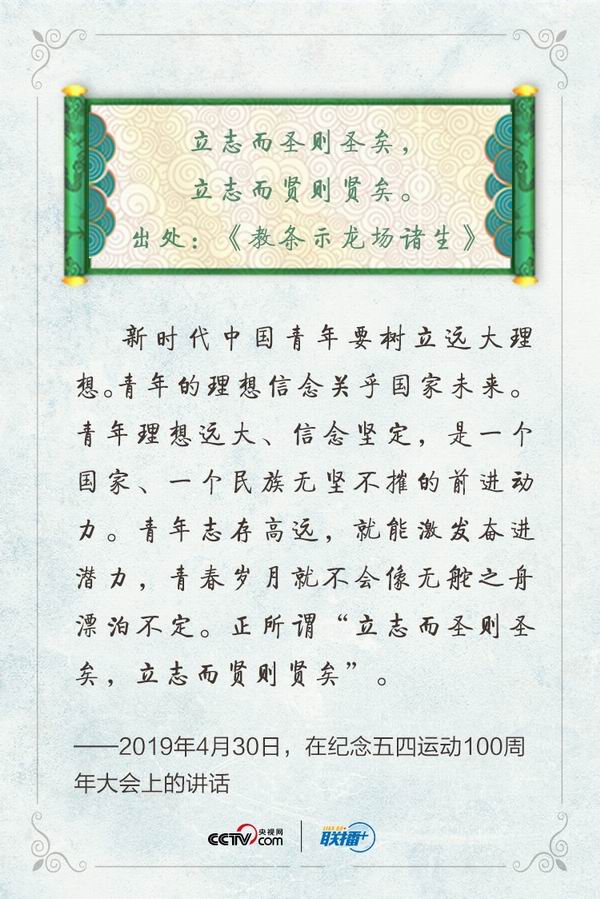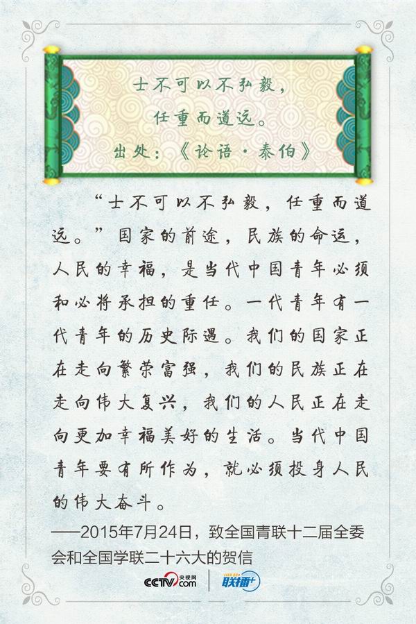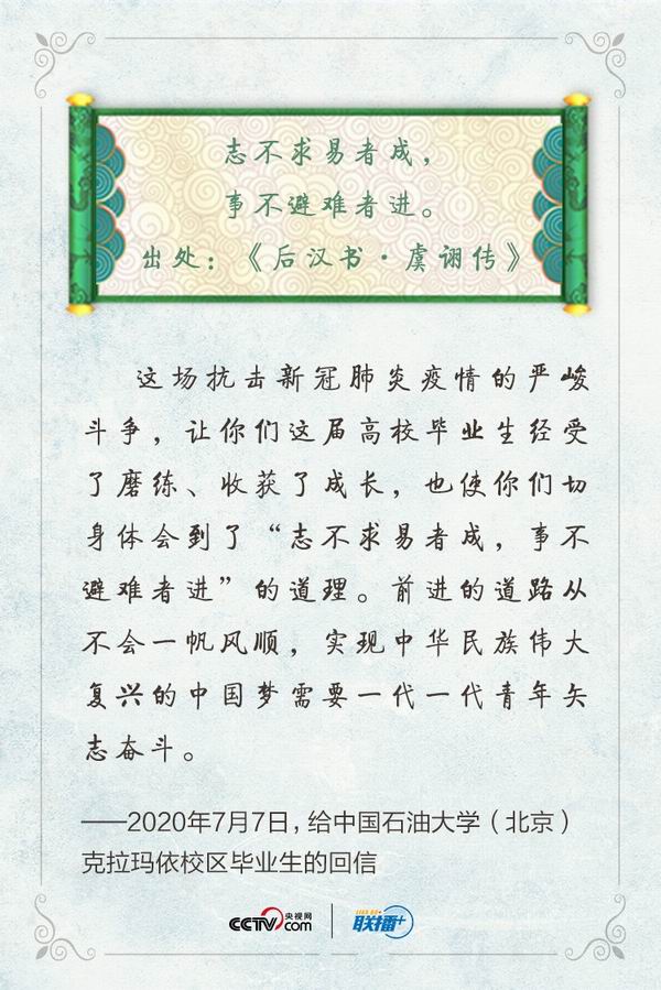 “這場抗擊新冠肺炎疫情的嚴峻斗爭,讓你們這屆高校畢業生經受了磨練、收獲了成長,也使你們切身體會到了‘志不求易者成,事不避難者進’的道理。前進的道路從不會一帆風順,實現中華民族偉大復興的中國夢需要一代一代青年矢志奮斗?!?/p> 7月7日,習近平總書記給中國石油大學(北京)克拉瑪依校區畢業生回信,肯定他們到邊疆基層工作的選擇,對廣大高校畢業生提出殷切期望。 青年興則國家興,青年強則國家強。黨的十八大以來,習近平總書記在同青年談心、給青年回信、參加青年活動時多次引用古文詩句勉勵青年,為青年走好人生路提供強大精神指引。央視網《聯播+》特梳理,與您共同感悟習近平總書記對青年的深情寄望。