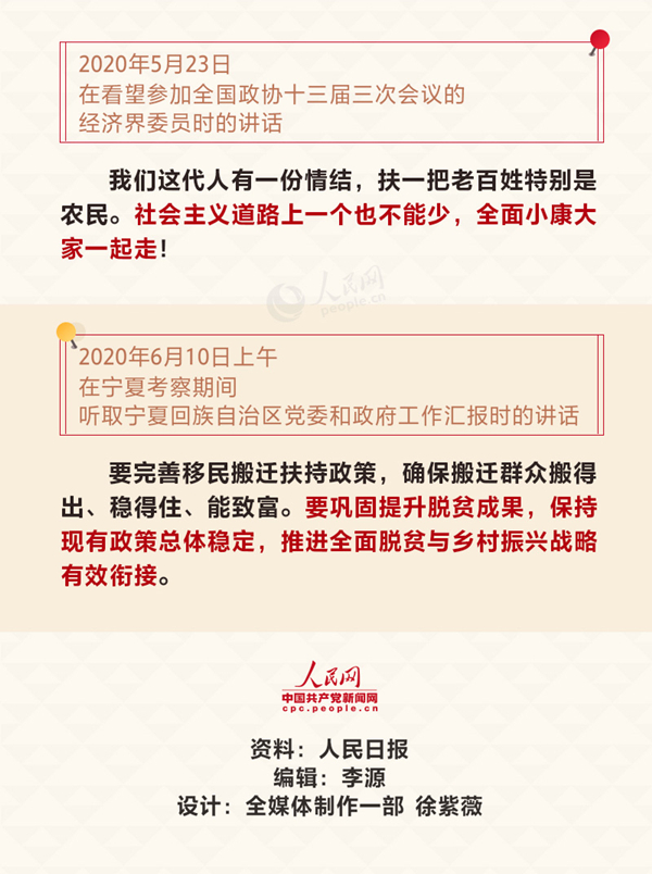 【前言】2020年注定是不平凡的一年。決戰決勝之年又遭遇新冠肺炎疫情影響,以習近平同志為核心的黨中央保持戰略定力,團結帶領全黨全國各族人民迎難而上,有效應對一系列風險挑戰。 細數今年上半年,習近平夙夜在公,勤勉工作,不斷刷新“忙碌指數”:數十次出席重要會議部署各項工作,8次國內考察,調研足跡遍及7省區市,3次出席國際重要會議并發表講話,20余次致信、回信海內外人士,60次就疫情防控等話題與40余位外國政要和國際組織負責人通電話……人民網·中國共產黨新聞網推出系列圖解報道,帶您全方面回顧習近平的2020上半年。 今天讓我們關注總書記的“扶貧”工作。