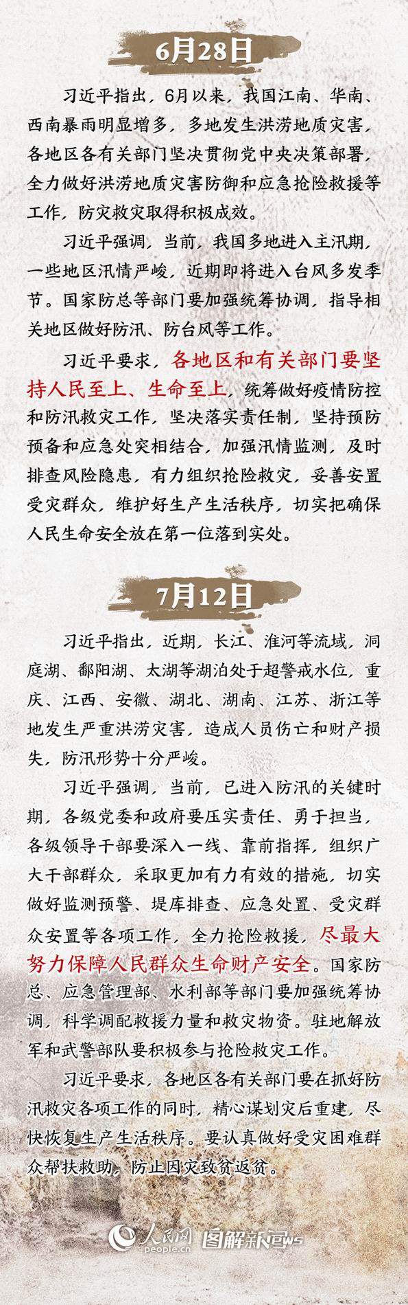 入汛以來,習(xí)近平總書記先后兩次對防汛救災(zāi)工作作出重要指示,強(qiáng)調(diào)要“盡最大努力保障人民群眾生命財(cái)產(chǎn)安全”。當(dāng)前防汛已進(jìn)入關(guān)鍵時(shí)期,各地各部門正深入貫徹落實(shí)習(xí)近平總書記重要指示精神,全力做好防汛抗洪工作,守護(hù)人民群眾生命財(cái)產(chǎn)安全。 兩次重要指示強(qiáng)調(diào)生命至上 面對嚴(yán)峻的防汛形勢,習(xí)近平總書記高度重視,于6月28日和7月12日先后兩次對防汛救災(zāi)工作作出重要指示。“人民至上、生命至上”,習(xí)近平要求各部門堅(jiān)持把確保人民群眾生命財(cái)產(chǎn)安全放在首位,落實(shí)責(zé)任,狠抓隱患排查,強(qiáng)化應(yīng)急預(yù)案,進(jìn)一步加強(qiáng)監(jiān)測預(yù)警、聯(lián)防聯(lián)動,為當(dāng)前防汛搶險(xiǎn)救災(zāi)工作指明了方向。