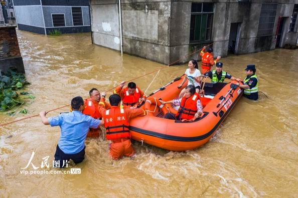 2020年7月10日,江西省吉安市新干縣應(yīng)急救援隊(duì)正在沂江鄉(xiāng)大洲村用皮筏艇轉(zhuǎn)移兩名受困群眾。(李福孫/人民圖片) 針對多地防汛救援物資短缺,國家防辦、應(yīng)急管理部會同國家糧食和物資儲備局向多個(gè)受災(zāi)嚴(yán)重的地區(qū)多次調(diào)撥中央救災(zāi)物資,支持地方救災(zāi)工作。自入汛以來,已累計(jì)調(diào)撥帳篷、折疊床、被子、毛毯和毛巾被等9.3萬件中央救災(zāi)物資。 水利部按照國家防總職責(zé)分工,聚焦超標(biāo)洪水、水庫失事、山洪災(zāi)害三大風(fēng)險(xiǎn)組織分析研判,科學(xué)調(diào)度水工程,共攔蓄洪水532億立方米;自然資源部強(qiáng)化地質(zhì)災(zāi)害監(jiān)測預(yù)報(bào)預(yù)警,成功避讓地質(zhì)災(zāi)害128起,應(yīng)急避險(xiǎn)5055人;中國氣象局嚴(yán)密監(jiān)測各種災(zāi)害性天氣過程,6月以來,中央氣象臺連續(xù)40天發(fā)布暴雨預(yù)警…… 農(nóng)業(yè)農(nóng)村部實(shí)行災(zāi)情日調(diào)度,堅(jiān)持24小時(shí)值班制度,并于7月14日啟動農(nóng)業(yè)重大自然災(zāi)害二級應(yīng)急響應(yīng),向江蘇、安徽、江西、湖北、湖南等5個(gè)省派出抗洪救災(zāi)專家工作組,會同地方農(nóng)業(yè)農(nóng)村部門完善防汛救災(zāi)和災(zāi)后生產(chǎn)恢復(fù)技術(shù)方案。 來之即戰(zhàn),戰(zhàn)之必勝。滾滾洪水當(dāng)前,解放軍、武警部隊(duì)、消防救援隊(duì)伍等也迅速投入到防汛抗洪搶險(xiǎn)救援當(dāng)中。 火箭軍某部數(shù)百名官兵在江西連日奮戰(zhàn),成功排除鄱陽縣西河?xùn)|聯(lián)圩港頭村段、西河?xùn)|聯(lián)圩龍尾村段、古縣渡鎮(zhèn)向陽圩等地?cái)?shù)十處堤壩險(xiǎn)情;陸軍部隊(duì)出動多支部隊(duì)7000余人赴江西九江、安徽銅陵等地參加抗洪搶險(xiǎn)救援任務(wù);武警廣西總隊(duì)柳州支隊(duì)官兵在沿江居民區(qū)連夜展開清淤工作,近9小時(shí)清理淤泥和雜物近9500立方;入汛以來,國家綜合性消防救援隊(duì)伍共參與各類抗洪搶險(xiǎn)救援4830起,營救遇險(xiǎn)被困群眾1.48萬余人,疏散轉(zhuǎn)移被困群眾6.1萬余人…… 生命就是一切,責(zé)任重于泰山。面對當(dāng)前防汛關(guān)鍵期的嚴(yán)峻形勢,多地打響了防汛抗洪“保衛(wèi)戰(zhàn)”。