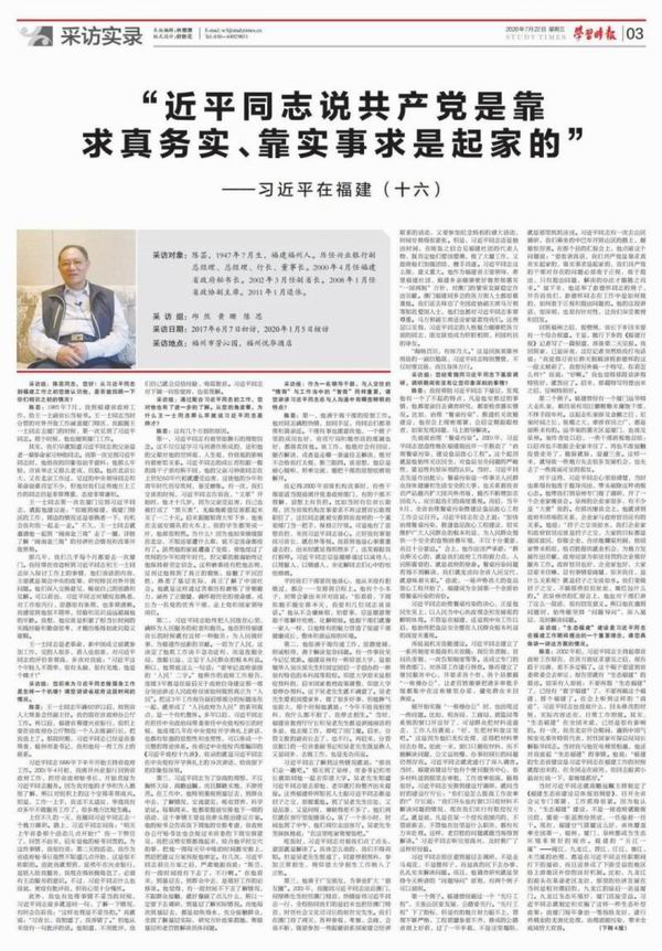 采訪對象:陳蕓,1947年7月生,福建福州人。歷任興業銀行副總經理、總經理、行長、董事長。2000年4月任福建省政府秘書長。2002年3月任副省長。2008年1月任省政協副主席。2011年1月退休。 采訪組:邱然黃珊陳思 采訪日期:2017年6月7日初訪,2020年1月5日核訪 采訪地點:福州市芳沁園,福州悅華酒店 采訪組: 陳蕓同志,您好!從習近平同志到福建工作之初您就認識他,是否能回顧一下你們相識之初的情況? 陳蕓: 1985年7月,我到福建省政府工作,給王一士副省長當秘書。王一士同志當時分管的對外開放工作涵蓋廈門特區,我跟隨王一士同志去廈門的時候,第一次見到了習近平同志。那個時候,他也剛到廈門工作。 其實,我們早就知道習近平同志的父親是老一輩革命家習仲勛同志。我第一次見到習近平同志時,他給我的印象很出乎意料:他那么年輕,言談舉止又那么老成、沉穩。他在北京長大,又在北京工作過,見過的中央領導同志和革命前輩肯定不少,但他對我們這些地方上工作的同志仍是非常尊重,態度非常謙和。 王一士同志第一次在廈門見到習近平同志,就跟他建議說:“你剛到福建,做廈門特區的工作,周邊的情況還是要熟悉一下,有機會我和你一起走一走。”不久,王一士同志就邀請他一起到“閩南金三角”走了一圈,詳細了解“閩南金三角”的經濟社會情況和改革開放形勢。 那幾年,我們幾乎每個月都要去一次廈門。我經常在旁邊聽到習近平同志和王一士同志深入探討工作上的事情,他們談話的內容,主要就是領會中央的政策,研究特區對外開放問題。他們深入交換意見,暢談自己的思路和見解。可以看出,習近平同志對情況很熟悉,對工作很內行,思路很有條理,也非常清晰。我感覺到他很不簡單,經驗和見識遠遠超越他的年齡。我想,他應該是積累了相當長時間的實踐經驗和勤奮思考,才能歷練得如此沉穩又敏銳。 王一士同志是老革命,新中國成立前就參加工作,見的人很多,看人也很準,對習近平同志的評價非常高,多次對我說:“習近平這個年輕人不簡單,很有頭腦,很有見地,他是個帥才!” 采訪組: 您后來為習近平同志做服務工作是怎樣一個機緣?請您講講省政府這段時間的情況。 陳蕓: 王一士同志年滿60歲以后,轉到省人大常委會任副主任。我仍留在省政府辦公廳工作。再以后,福建省籌建興業銀行,組織上要在省政府辦公廳物色一個人去做副行長,把我選上了。那段時期,習近平同志已經是省委常委、福州市委書記,我和他有一些工作上的聯系。 習近平同志1999年下半年開始主持省政府工作。2001年4月初,我離開興業銀行回到省政府工作,擔任省政府秘書長,開始直接為習近平同志服務。因為我對他的才華和為人都很了解,所以對組織上的這個安排非常高興。但是,工作一上手,我還不太適應,畢竟我有10多年不做服務工作了,很多地方比較生疏。 上任不久的一天,我隨同習近平同志去一個地方調研。路上,習近平同志問我:“明天上午省委那個活動幾點開始?”我一下愣住了,回答不出來,后來是他的秘書回答的。為這件事情,我很自責:第二天的活動,我作為省政府秘書長竟然不知道幾點開始,這是很不稱職的。由此我就想到,前些年在興業銀行,是別人給我服務,我現在得轉換角色了,必須有主動服務的意識。不過,習近平同志什么也沒說,更沒有批評我,但我心里十分愧疚。 此外,我也有處理事情不妥當的時候,習近平同志最多就是問一句,了解一下情況,有時會告訴我:“這樣處理是不妥當的。”我就說:“習省長,我知道了,我弄錯了。”但他從來沒有一句批評的話。他知道,不用批評,我們自己就會總結經驗、吸取教訓。習近平同志對下屬一向很寬容,也很理解。 采訪組: 通過配合習近平同志的工作,您對他也有了進一步的了解。從您的角度看,為什么王一士同志那么早就說習近平同志是帥才? 陳蕓: 這有幾個方面的原因。 第一,習近平同志有著堅如磐石的理想信念。這不僅僅是學習馬列著作形成的,還和他的父輩對他的世界觀、人生觀、價值觀的影響有著密切關系。習近平同志的成長歷程跟一般的高干子弟有所不同,他的父親習仲勛同志在上世紀60年代初就遭受迫害,這使他的少年和青年時代歷盡坎坷,備受磨煉。有一次,我們交談的時候,習近平同志告訴我,“文革”開始時,他才十幾歲,因為父親受迫害,自己也被打成了“黑五類”,無端地被造反派抓起來關了一二十天。后來跟隨知青大軍下鄉,他坐在去延安插隊的火車上,別的學生都哭成一片,他卻很坦然。為什么?因為他如果繼續留在北京,不知還要遭什么難,說不定連命都沒有了。雖然他的家庭遭遇了變故,使他度過了坎坷的少年和青年時代,但父輩的教誨始終讓他保持著堅定信念。這種磨難沒有把他擊垮,反而讓他得到了真正的鍛煉,接觸了平民百姓,熟悉了基層實際,真正了解了中國社會。他就是這樣通過苦難歷程磨煉了堅韌毅力,涵養了正能量,滿懷著歷史的使命感,成長為一名黨的優秀干部,走上黨和國家領導崗位。 第二,習近平同志始終把人民放在心里,滿懷為人民服務的初衷和抱負。他在擔任福建省長的時候就有這樣一種抱負:為人民做好事,為福建作出新的貢獻。一切為了人民,這決定了他抓工作決不急功近利,而是放眼全局,放眼長遠,立足于人民群眾的根本利益。所以,他常說這么一句話:“要牢記政府前面的‘人民’二字。