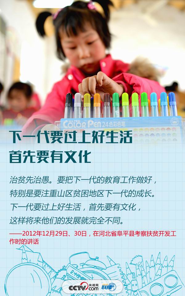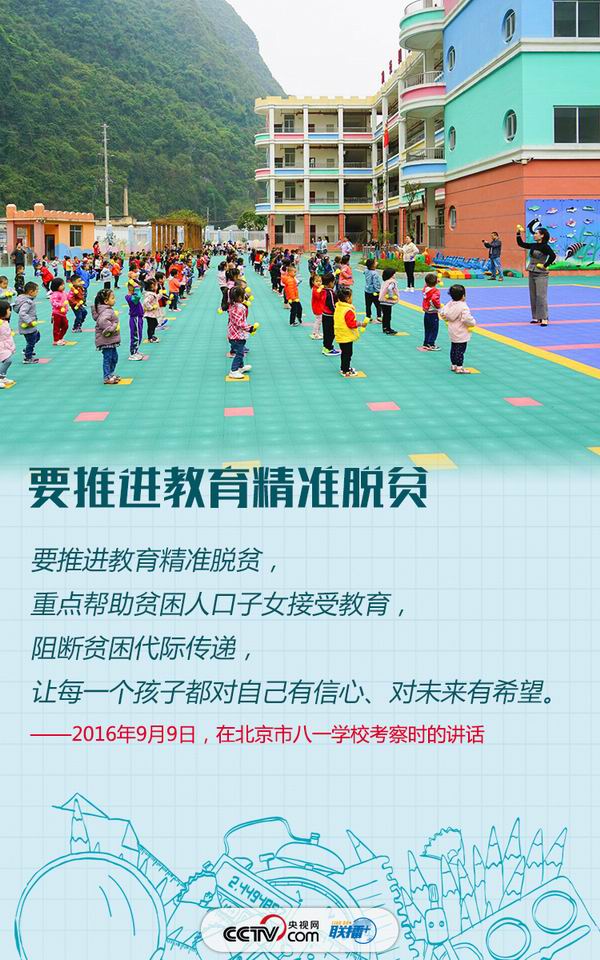 聯播+ 治貧先治愚,扶貧先扶智。 習近平總書記曾在多個場合強調教育扶貧的重要意義,希望通過教育讓同學們認識到造成貧困的原因,找到解決貧困的辦法,從而“立鴻鵠志,做奮斗者”,以實際行動證明自己“不愧為大有希望、大有作為的一代”。 2019年底,全國832個國家級貧困縣義務教育階段輟學學生人數已由臺賬建立之初的29萬減少至2.3萬,其中建檔立卡家庭貧困學生人數由15萬減少至0.6萬。全國99.8%的義務教育學校(含教學點)辦學條件達到“20條底線”要求……貧困地區義務教育學校辦學條件已有顯著改善,這也意味著通過教育扶貧,越來越多的貧困學子能夠順利完成學業。 時值開學季,讓我們一同重溫總書記關于教育扶貧的殷殷囑托和深切期望,感受做好扶貧工作的堅定力量。