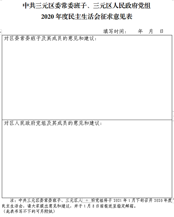 中共三元區(qū)委常委班子、三元區(qū)人民政府黨組2020年度民主生活會(huì)征求意見(jiàn)表