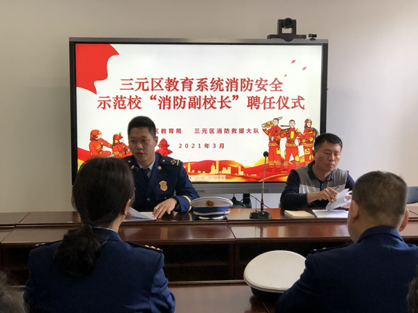 為貫徹落實支隊《關于開展創建消防安全示范學校暨聘任“消防副校長”工作的通知》的文件要求,進一步做好消防安全“進學?!?,推動消防安全示范學校創建工作。全面提升全區校園安全標準化管理 ,扎實推進安全宣傳 “五進”工作,有效提升全區教育系統師生消防安全意識和逃生自救能力。3月18日上午,在三元區教育局會議室召開三元區教育系統消防安全示范校聘任 “消防副校長”儀式。大隊挑選符合條件的6名指戰員擔任“消防副校長,聘期為兩年,將全面落實“消防副校長”工作職責。
