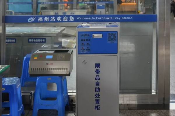 不用擔(dān)心,部分火車站在安檢口處置臺(tái)旁邊安裝了限帶品自助處置柜,只需幾步,就能把限帶物品寄回家。