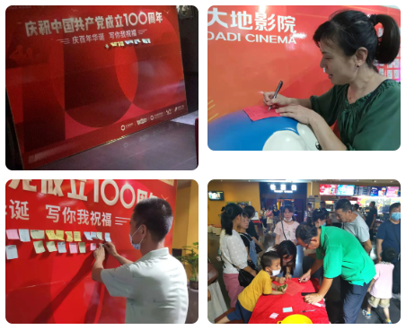 此次活動,大家深受觸動和鼓舞,紛紛表示今后將加強黨史學習,發揚黨的優良傳統和作風,傳承紅色基因,堅定理想信念,從百年黨史中汲取力量,做到學史明理、學史增信、學史崇德、學史力行,以昂揚的斗志、飽滿的熱情、旺盛的干勁投入今后的學習和工作,以實際行動向黨的一百周年獻禮。 觀影結束,東霞社區老黨員說:沒有中國共產黨就沒有新中國,沒有今天的幸福美好生活。作為一名老黨員,他要繼續堅定理想信念,筑牢初心使命,永遠聽黨話、跟黨走,繼續發揮作用,為社會發展貢獻力量。 各支部黨員寫下: “建黨100周年,祝愿黨的光芒永照耀!” “愿偉大的中國共產黨帶領我們走向新的輝煌” “感謝黨恩,在黨的領導下建設中國美好明天!” “讓我們把最美的祝福送給你——敬愛的黨!” “愿黨的明天放光彩,黨的未來更輝煌!”等等祝福語。