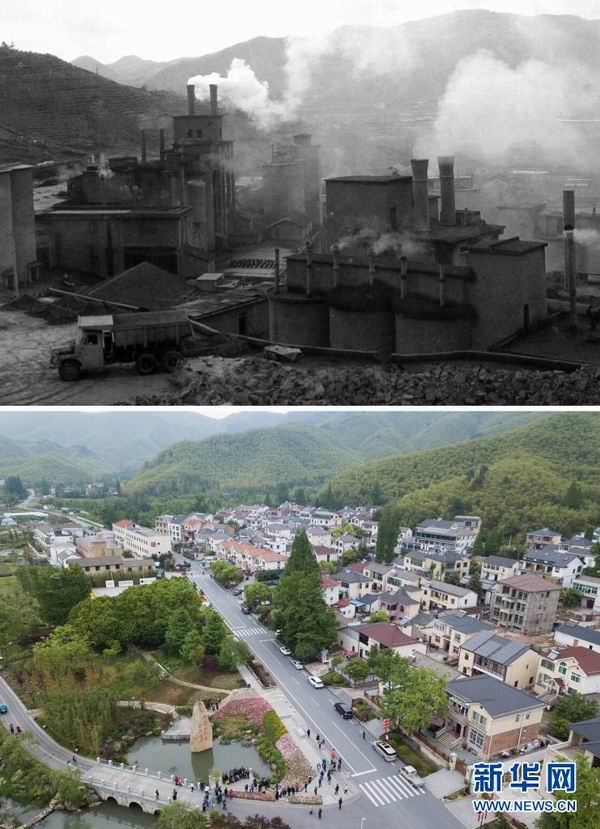 拼版照片:上圖為浙江省湖州市安吉縣天荒坪鎮余村上世紀八十年代的資料照片;下圖為2018年4月24日,游客在整修一新的余村游覽拍照(新華社記者翁忻旸攝)。新華社發 仲夏時節,浙江余村綠意正濃,一派江南好風光。 從昔日水泥廠、采石場遍布,漫天灰塵迷人眼,到如今被拆遷的水泥廠舊址變身五彩田園,余村多年來的綠色發展實踐,生動詮釋著“綠水青山就是金山銀山”的深刻內涵。 以“中國夢”凝聚最大公約數,以“五位一體”部署總體布局,以“四個全面”謀劃戰略布局,以“一帶一路”擴展國際合作新空間,以構建新發展格局開啟全面建設社會主義現代化國家新征程…… 習近平新時代中國特色社會主義思想引領黨和國家事業發生歷史性變革、取得歷史性成就,中華民族迎來偉大復興的光明前景。 實事求是,永葆創新活力