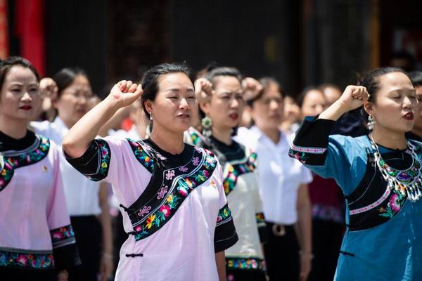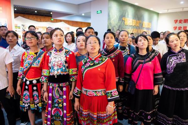 湖南湘西十八洞村開展新黨員代表入黨宣誓活動并參觀精準扶貧展示廳。新華社記者陳思汗攝