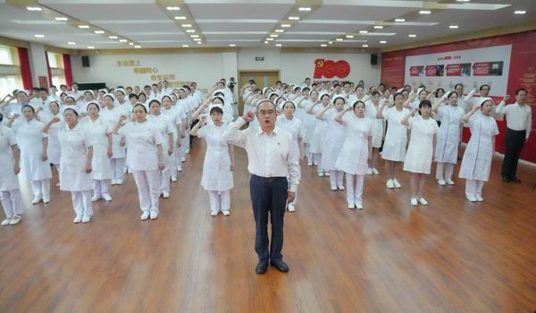 湖北武漢金銀潭醫院,武漢市衛健委系統新黨員入黨宣誓活動在此舉行,“人民英雄”國家榮譽稱號獲得者張定宇領誓。新華社記者程敏攝
