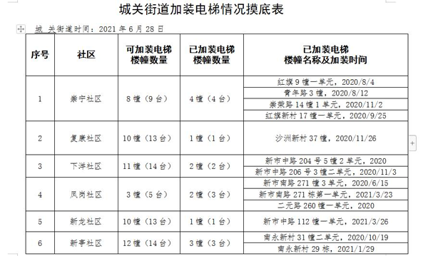 下一步街道將在前期摸底的基礎上加大攻堅力度,主動作為促成居民達成統一意見,確保“裝電梯,建車位”工作落實見效。 城關街道 為真正打通服務群眾的“最后一公里”,近日來,城關街道以群眾反映的加裝電梯與停車難為突破點,著力解決群眾“急難愁盼”的問題。 高位推進,在調研走訪中發現問題 制定《城關街道進一步推進社區治理工作方案》,細化工作目標到崗,責任到人。6月26日起所有掛居領導深入一線了解實情、掌握民意。對所有建筑達6層以上無電梯的住宅樓房、小區進行全面摸底,目前符合加裝條件的有73幢104單元,其中三分之二意愿的有27單元、二分之一意愿的有35單元,暫無意愿的42單元。同時,領導小組重點針對有大部分意愿的住戶存在的問題進行逐個分類梳理,已梳理出加裝電梯、停車難問題19個。