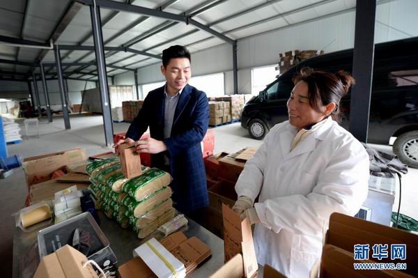 在河南省信陽(yáng)市潢川縣付店鎮(zhèn)劉樓村,村黨支部書記胡曉柱(左)與一位空心貢面生產(chǎn)工人交流(3月18日攝)。新華社記者 馮大鵬 攝 |