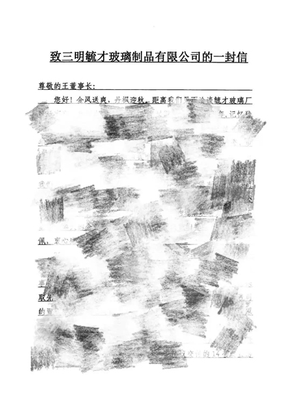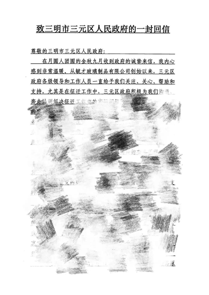 9月27日,這是一封來自福建三明毓才玻璃制品有限公司王董事長寫給三元區富興堡街道征遷團隊的回信。 10月31日,福建三明毓才玻璃制品有限公司簽訂補償協議,收儲土地面積34079.66平方米,建筑面積28232.889平方米。同時,歷時14年之久建筑面積1482.89平方米的歷史遺留問題圓滿解決。至此,富興堡片區——毓才玻璃廠及周邊地塊項目4家企業全面完成征收。