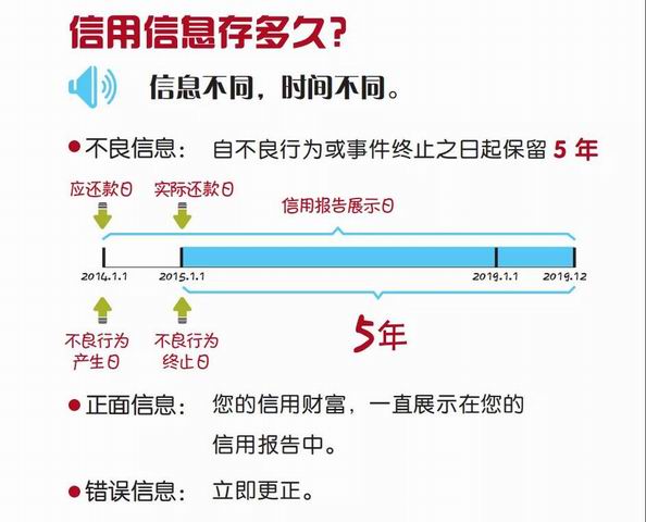 圖片來源:中國人民銀行征信中心 信用報(bào)告包含基本信息(身份信息、居住信息、職業(yè)信息等)、信貸信息(指借債還錢信息,信用報(bào)告中最核心的信息)、非金融負(fù)債信息(先消費(fèi)后付款形成的信息,如電信繳費(fèi))、公共信息(社保公積金信息、法院信息、欠稅信息、行政執(zhí)法信息等)、查詢信息(過去2年內(nèi),何人何時(shí)因?yàn)槭裁丛虿檫^您的信用報(bào)告)等內(nèi)容。如果出現(xiàn)違約、欠稅、法院和行政處罰信息等,就會(huì)有“不良信息”,不良信息自不良行為或事件終止之日起保留5年。 也就是說,相關(guān)不良信息超過5年,就會(huì)被刪除。若有特殊情況造成不良信息的,也可申請對不良信息作出聲明,在保存期內(nèi),征信機(jī)構(gòu)會(huì)予以記載。