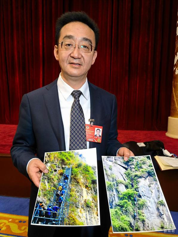△益西達瓦委員展示的懸崖村對比圖。(總臺央視記者盧心雨、趙化拍攝) 莫榮、王海京也是來自社會福利和社會保障界的委員,他們分別提出了推動社保人員全覆蓋、助力社會組織在推進共同富裕中發揮更大作用等建議。