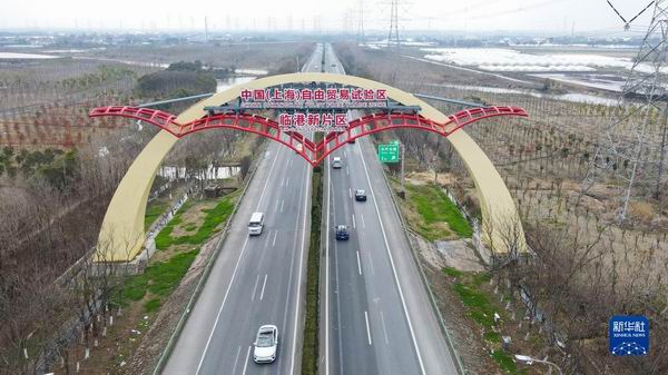 這是2022年2月10日拍攝的S2滬蘆高速上的中國(上海)自由貿易試驗區臨港新片區“海鷗門”(無人機照片)。新華社記者 方喆 攝 正在打造社會主義現代化建設引領區的上海市浦東新區,改革發展春意正濃:上海自貿區臨港新片區,22個集成電路項目集中落戶;對接RCEP協議,全球最大國產重型礦車簽訂出口租賃合同…… “堅持大膽試、大膽闖、自主改,著力在改革的集成性、開放的制度型、創新的策源力上下功夫。”上海市委常委、浦東新區區委書記朱芝松代表說。