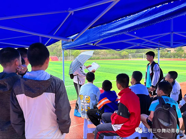 隊員們互相加油鼓勁,大喊著口號:三明三中!加油加油加油! 劉教練在雨中為隊員們分析局勢,布置戰術。