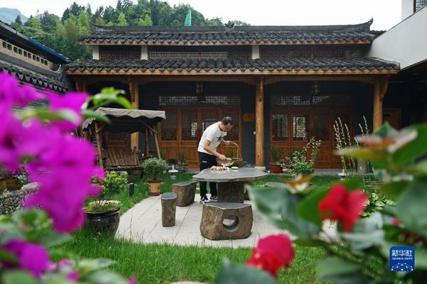 6月14日,民宿業主季發東在民宿院中晾曬大蒜。新華社記者 林光耀 攝 6月16日,浙江省麗水市云和縣梯田腳下的梅源村,民宿業主季發東拿出自家種的大蒜,平鋪在院子里的石桌上晾曬。“準備把蒜頭做成我們本地的特色咸菜,當炒菜輔料或早餐小菜,讓來住宿的游客品嘗‘云和味道’。” 2016年起,云和大力開發梯田景區,美麗風景吸引了眾多游客。看到發展機會,季發東辭去工作,投資120余萬元將老宅裝修成民宿。