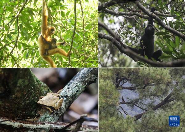 拼版照片:左上圖為2021年5月拍攝的海南長臂猿B群幼猿(海南熱帶雨林國家公園管理局供圖);右上圖為在海南熱帶雨林國家公園體制試點區霸王嶺自然保護區內拍攝的海南長臂猿(2019年10月25日新華社記者蒲曉旭攝);左下圖為在霸王嶺自然保護區內拍攝的姬蛙(2019年10月26日新華社記者蒲曉旭攝);右下圖為在霸王嶺自然保護區內拍攝的蛇雕(2019年10月26日新華社記者蒲曉旭攝)。 新華社發 國家公園五指山片區,大山深處的毛納村不砍樹、不占田,大力發展鄉村旅游業和茶葉特色產業。村民王瓊香說,她的茶園每年有10多萬元收入,毛納村家家戶戶種茶脫貧致富。