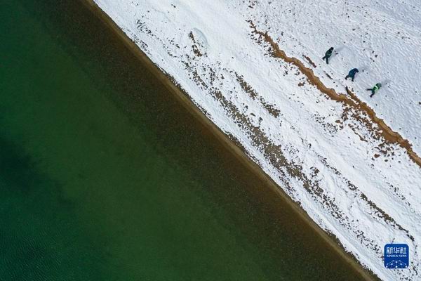 在青海省果洛藏族自治州瑪多縣扎陵湖鄉勒那村,三江源國家公園黃河源園區生態管護員在巡護(2021年10月20日攝,無人機照片)。 新華社記者 張龍 攝