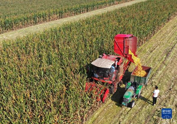 農機手駕駛收割機在河南省尉氏縣張市鎮沈家村為村民收獲玉米(9月18日攝,無人機照片)。新華社記者 李嘉南 攝 河南省尉氏縣張市鎮沈家村,是一個地處中原腹地、以“噸糧田”(兩季田)聞名的糧食高產村。 剛進沈家村,映入眼簾的是寫著“慶豐收同心共富 迎盛會齊向未來”的紅色條幅。一旁的高質量農田里,大型收割機來回穿梭。村口不時有村民駕駛滿載玉米的農用車進進出出,喜氣洋洋。 “今年小麥、玉米雙豐收,大家喜上眉梢。”沈家村村支書石長鎖說。