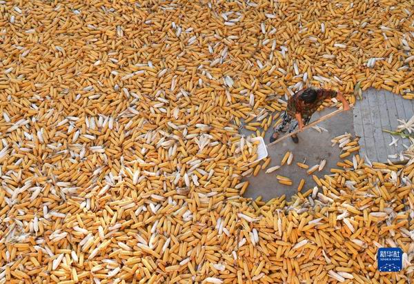 河南省尉氏縣張市鎮沈家村村民將收獲的玉米攤開(9月17日攝)。新華社記者 李嘉南 攝 一戶農家院內,村民孫六與郭顯春一人手持一把大頭鏟,正將一堆玉米棒鏟進手推車里,再由樓上兩名村民用吊機吊到二樓,鋪開、晾曬。 “今年收成怎么樣?” 聽到記者搭話,55歲的孫六停下手里的活,臉上滿是笑容:“收成不賴,大豐收。”她一邊招呼記者坐下,一邊彎腰拾起一個玉米棒說:“一斤玉米棒能剝出九兩籽,每畝打1300斤。只會多,不會少!” “今年盡管旱,但澆水足,苞谷從種到收,澆了四遍水。多虧了高標準農田建設,又打機井又通電,澆地不作難。”孫六樂呵呵地說。