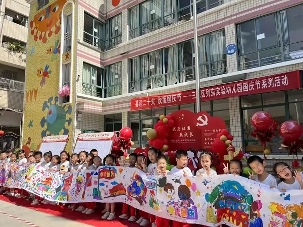 秋風送爽,丹桂飄香 為慶祝中華人民共和國成立73周年 迎接黨的二十大勝利召開 在國慶節來臨之際 三元學子用自己的方式 為祖國母親送祝福 01列東實驗幼兒園 開展“喜迎二十大·同心迎國慶”系列活動,活動由“有聲環境·營造氛圍”、“喜迎國慶·禮贊祖國”、“千里江山·盛世華誕”、“童心愛國·游戲增彩”四個部分組成。“天安門、五星紅旗、和平鴿、宇宙飛船……”教師帶領大班幼兒一起手繪一幅十米《祖國如此多嬌》畫卷,描繪出對黨和祖國的熱愛。