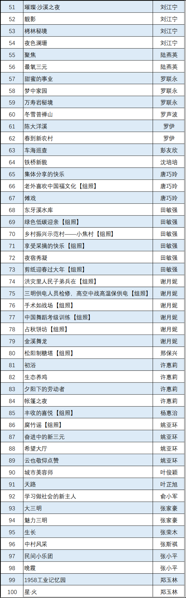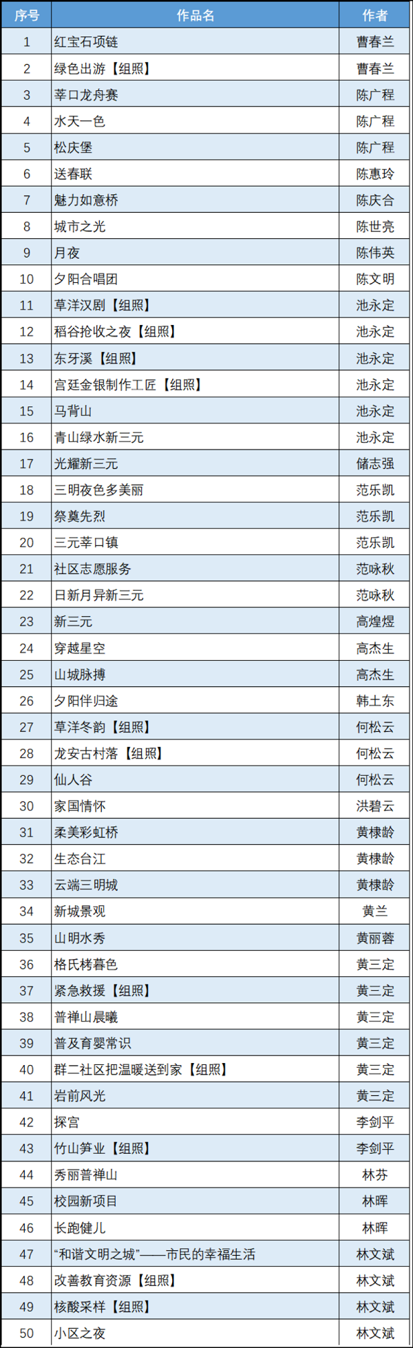 在黨的二十大即將勝利召開之際,在中共三元區委宣傳部的指導下,三元區文體和旅游局、三元區融媒體中心、三元區林業局、三元區農業農村局、三元區社科聯和三元區文聯共同舉辦了 “喜迎二十大·奮進新三元”攝影作品展。 截至9月30日,展會完成了作品征集,共收到2300余幅(組)作品。于10月1日至5日進行了多輪評審,最終選出100幅(組)佳作。這些作品突出展示三元區經濟社會發展的顯著成就,以及全區人文景觀、自然風光、民俗風情、社會生活等內容,讓人民群眾真切地感受到更多的幸福感、獲得感和安全感。同時,充分展示廣大攝影工作者和愛好者深入生活、扎根人民、辛勤創作取得的豐碩成果,向黨的二十大獻禮。 參加此次參展作品評審的有:福建省攝影家協會副主席、三明市攝影家協會主席楊為春,三明市攝影家協會副主席、秘書長謝守明,三明市攝影家協會副秘書長、三元區攝影家協會主席曹建平,三元區文聯主席郭新軍,三元區文旅局副局長張淋玲,三元區融媒體中心主任莊萬強。 現將入選名單揭曉如下: