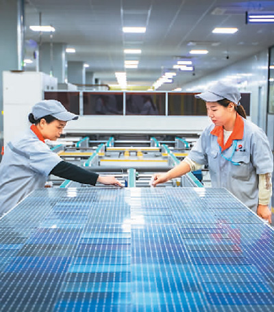 浙江省金華市金東區工業園區,一家自動化生產光伏太陽能組件公司技術工人正在對外貿訂單產品進行單片質量檢測校驗。 楊梅清攝(人民視覺)
