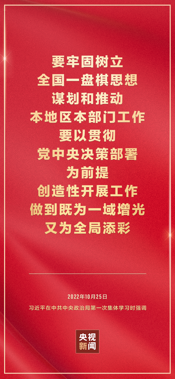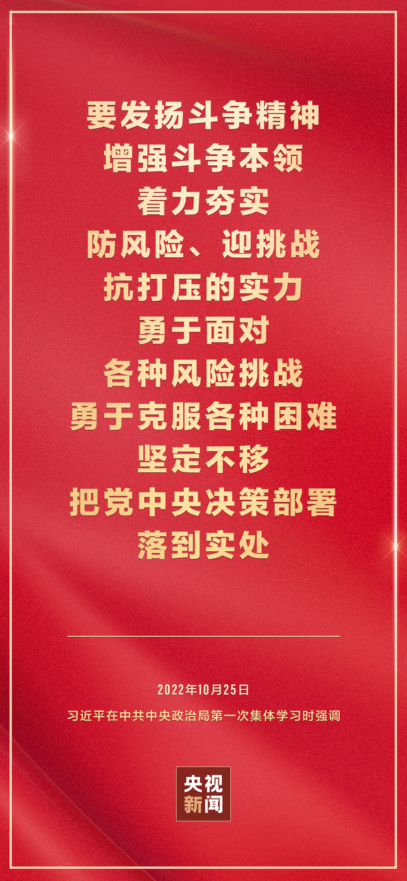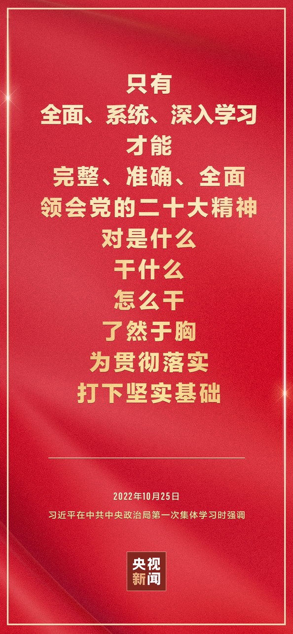 二十屆中共中央政治局10月25日下午就學(xué)習(xí)貫徹黨的二十大精神進(jìn)行第一次集體學(xué)習(xí)。中共中央總書記習(xí)近平在主持學(xué)習(xí)時(shí)強(qiáng)調(diào),全黨要在全面學(xué)習(xí)、全面把握、全面落實(shí)上下功夫,堅(jiān)定不移把黨的二十大提出的目標(biāo)任務(wù)落到實(shí)處,奮力奪取全面建設(shè)社會(huì)主義現(xiàn)代化國(guó)家新勝利。
