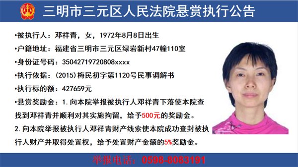 為查找被執行人下落及財產線索,現根據《最高人民法院關于民事執行中財產調查若干問題的規定》第二十一條、第二十二條、第二十三條、第二十四條,以及《最高人民法院關于依法制裁規避執行行為的若干意見》的有關規定,向社會發布懸賞舉報公告。