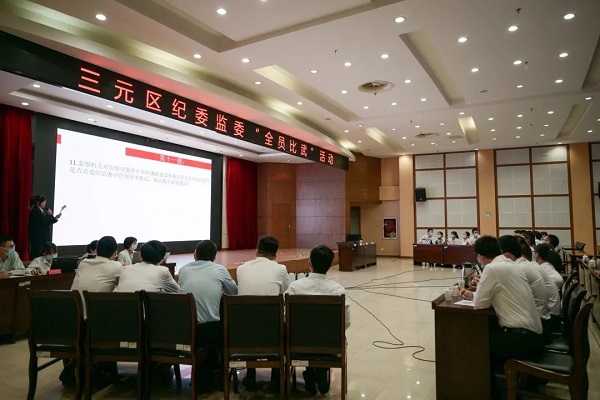 黨的二十大報告強調,全面從嚴治黨永遠在路上,黨的自我革命永遠在路上。新時代對紀檢監察工作提出了更新更高要求,夯實履職基礎、鍛造紀檢“精兵”成為推動紀檢監察工作高質量發展的必然要求。 三元區紀委監委聚焦建設高素質、專業化隊伍,強化總體謀劃、注重措施落實,打好紀檢監察干部業務能力提升“組合拳”,著力鍛造紀檢監察精兵強將。此次“全員比武”,就是區紀委監委以賽促學,錘煉紀檢監察“鐵軍”隊伍,貫徹落實黨的二十大精神的具體舉措。“全員比武”包含業務競答、現場問答、場景找茬、案例分析4個環節,聚焦考核參賽隊員的理論素養、業務能力和實戰水平,緊扣黨的二十大精神、黨紀法規、監督檢查、審查調查、辦案安全、案件質量等方面出題,并堅持問題導向,結合日常監督檢查和審查調查中容易出現疏漏的地方,設置“攔路虎”。參賽隊伍以協作片區為單位,每隊5人,均為“委機關+派駐機構+鄉鎮(街道)”組合。比賽通過現場問答和還原工作場景等形式,促進參賽隊伍踴躍作答、“清障掃雷”,并按最后得分高低進行評獎。“下面進入場景找茬環節,請各隊上來抽取題目,比賽的要求是……”比賽有序推進、難度節節攀升,既考驗各隊單兵作戰能力,又考驗團隊協作精神。