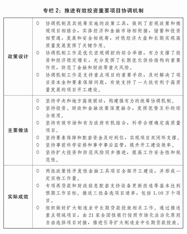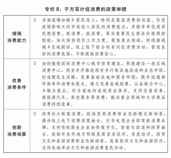 (三)堅定實施擴大內需戰略,內需潛力持續釋放。扎實推動構建新發展格局“1+N”政策體系落實落細,制定實施擴大內需戰略規劃綱要(2022-2035年)和“十四五”擴大內需戰略實施方案,聚焦重點領域擴投資穩消費,進一步激發國內需求潛力,促進國內大循環加快暢通。 一是投資關鍵作用充分發揮。建立并高效運轉推進有效投資重要項目協調機制,強化用地、環評、用能等要素保障和重大問題協調,做到“資金、要素跟著項目走”,加快推進重點任務落實和重大項目建設,努力形成更多實物工作量。創新設立政策性開發性金融工具,分兩批投放基金7400億元,為重大項目建設補充資本金,支持的2700多個重大項目已全部開工。通過專項再貸款與財政貼息配套支持重點領域設備更新改造,推動擴大制造業中長期貸款投放。適度超前開展基礎設施投資,推進“十四五”規劃102項重大工程實施,新型基礎設施加快布局,川藏鐵路全面建設取得良好開局,裝機規模全球第二大的白鶴灘水電站全面投產,白鶴灘至江蘇、浙江特高壓直流輸電工程運行,小洋山北側集裝箱碼頭(陸域部分)、平陸運河工程、南水北調中線引江補漢工程等開工建設。發揮中央預算內投資撬動作用。加快地方政府專項債券發行使用并進一步擴大支持范圍。鼓勵引導社會資本盤活老項目、投入新項目,促進存量資產和新增投資良性循環,已累計發行上市基礎設施領域不動產投資信托基金(REITs)試點項目24個,總發行規模超過780億元。全面推進城鎮老舊小區改造,全國實際新開工老舊小區改造5.25萬個。城市基礎設施建設短板加快補齊,城市燃氣管道等老化更新改造積極推進。全國固定資產投資(不含農戶)57.21萬億元,增長5.1%;其中,基礎設施、制造業投資分別增長9.4%、9.1%,一定程度彌補了消費收縮缺口。